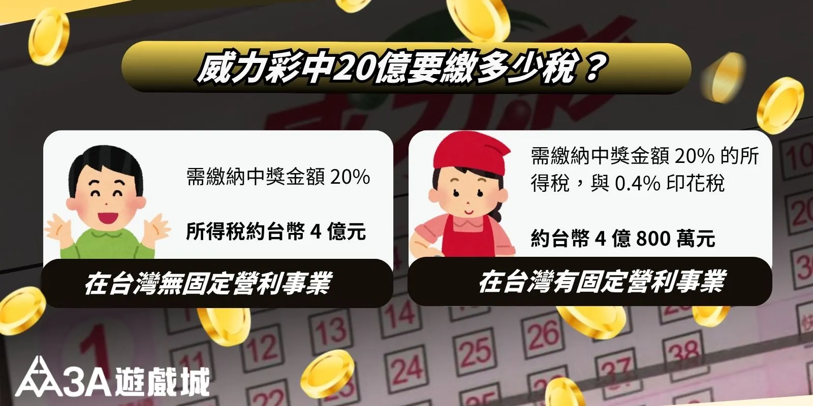 A:若中獎金額超過 5,000 元,需繳納 20% 所得稅;若為在台有固定營利事業者,另須繳 0.4% 印花稅。